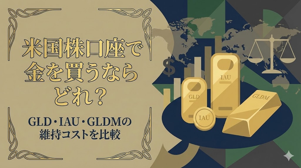 「株が下がったときのお守りがほしい」「資産の一部を金(ゴールド)で持っておきたい」と考えたことはありませんか。米国株口座を使えば、スマホ1つで金に投資できる便利な時代です。でも、選ぶ銘柄によって、毎年引かれる手数料が4倍も違うことを知っている人は意外と多くありません。この記事では、代表的な金ETFであるGLD、IAU、GLDMの3つを徹底的に見比べます。最後まで読めば、あなたの大切な資産を無駄なコストから守る最適な1本が見つかります。